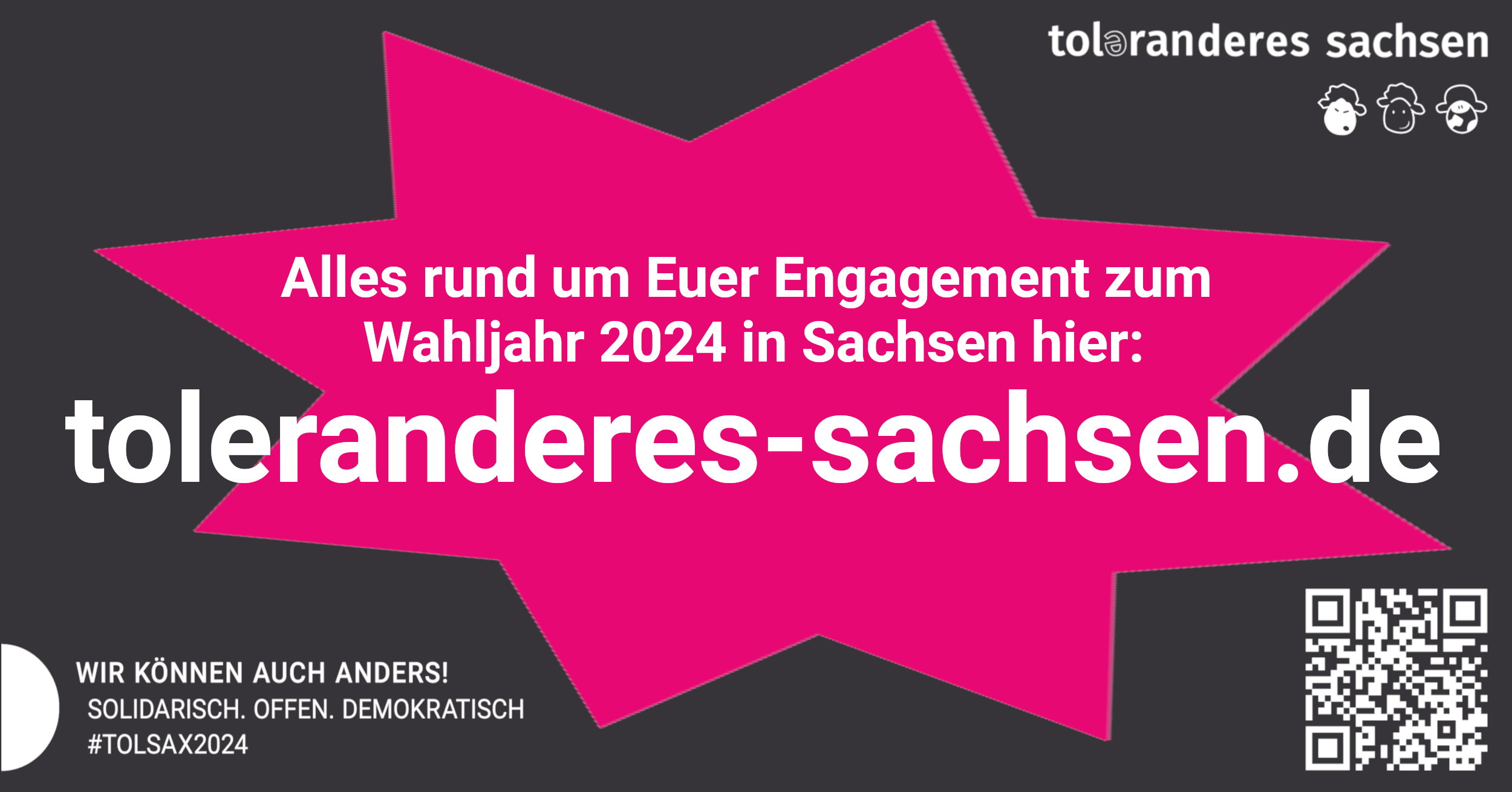2024 ist in Sachsen Wahljahr. Damit Sachsen demokratisch bleibt, braucht es uns alle. Auf unserer neuen Seite Toleranderes Sachsen findet Ihr Informationen zu Kampagnen und Bündnissen, Material für die politische Bildung, Workshopangebote und mehr.