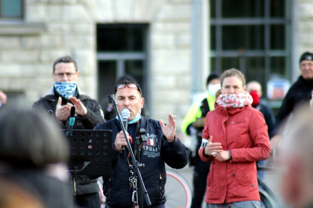 Freitag, Michael (2020): Stephane Simon am 12. Mai 2020 am offenen Mikrophon bei der „Bewegung Leipzig“. Und einer der Mitorganisatoren applaudiert, 30.05.2020, https://www.l-iz.de/politik/leipzig/2020/05/Die-ausgefallene-Revolution-Zeigt-uns-den-Virus-dann-zeigen-wir-unsere-Masken-333290/attachment/STephan, 30.05.2020