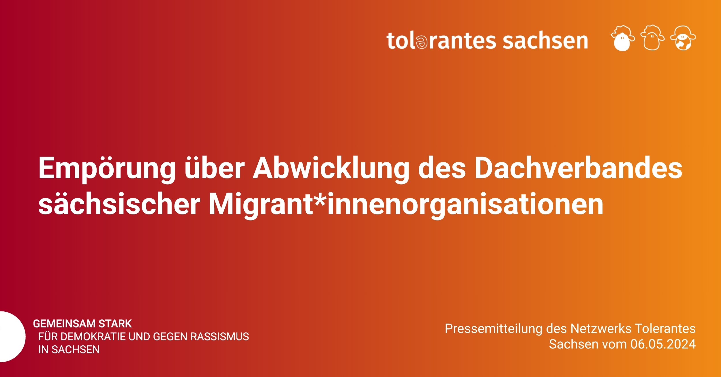 Der Sprecher_innenrat des Netzwerks Tolerantes Sachsen sieht skandalöses Vorgehen in der mittelbar beförderten Insolvenz des Dachverbandes sächsischer Migrant*innenorganisationen (DSM) durch den Sächsischen Rechnungshof und die Sächsische Aufbaubank. Gerade angesichts erstarkender extrem rechter Strukturen, den Angriffen auf das demokratische Gemeinwesen und Forderungen nach ‚Remigration‘ ist es ein fatales Signal, den Dachverband sächsischer Migrant*innenorganisationen sieben Jahre nach seiner Gründung auf diese Weise abzuwickeln. Damit entsolidarisiert sich schlussendlich die Mehrheitsgesellschaft von den Gruppen, die am meisten von den menschenverachtenden Plänen der extremen Rechten betroffen sind.