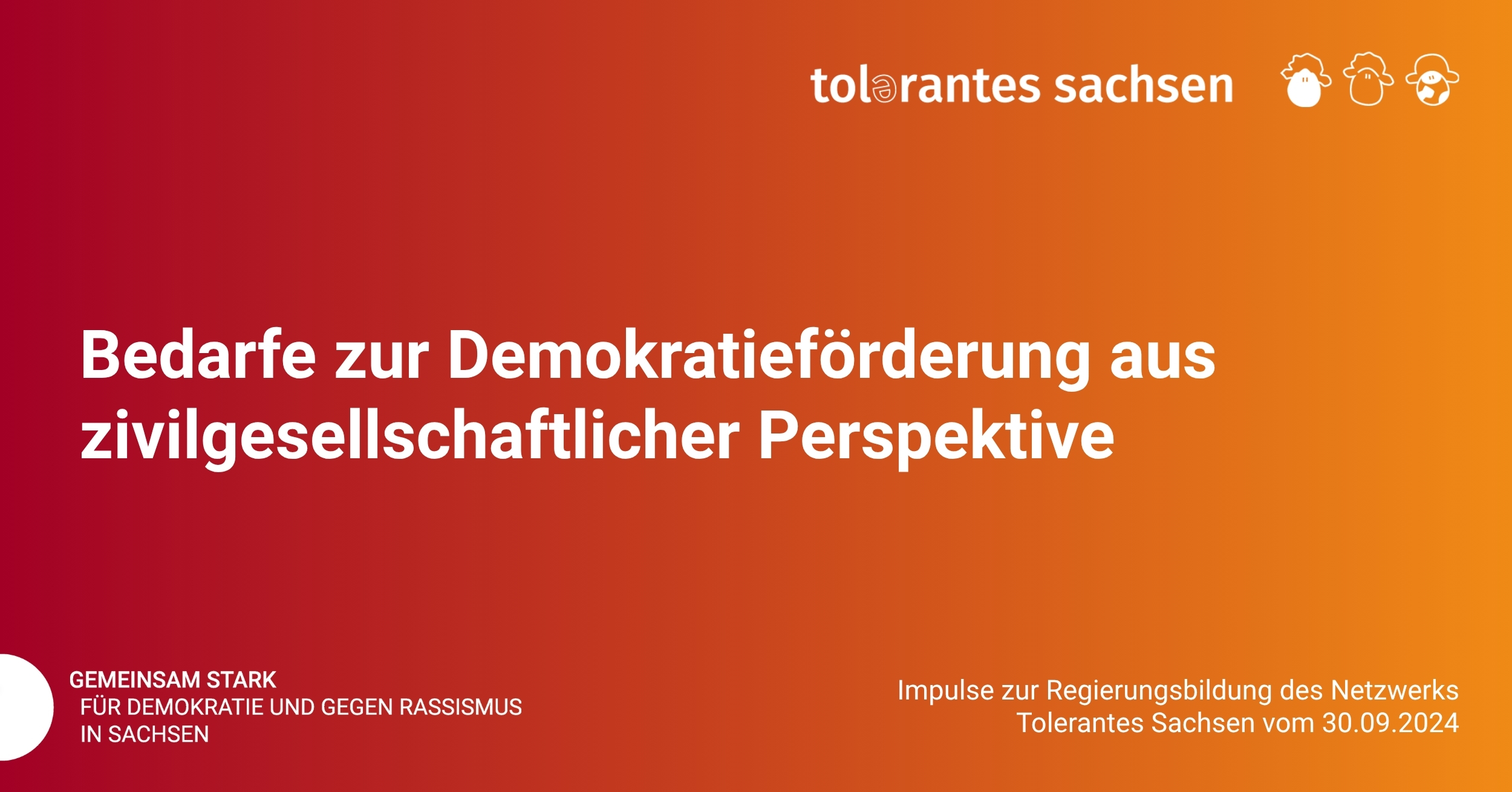Der Sprecher_innenrat des Netzwerks Tolerantes Sachsen hat ein Forderungspapier erstellt, um gezielt gemeinsame Forderungen und Impulse aus der Zivilgesellschaft in die Sondierungs- und Koalitionsgespräche zu geben. In dem Papier werden die Bedarfe zur Demokratieförderung aus zivilgesellschaftlicher Perspektive formuliert.