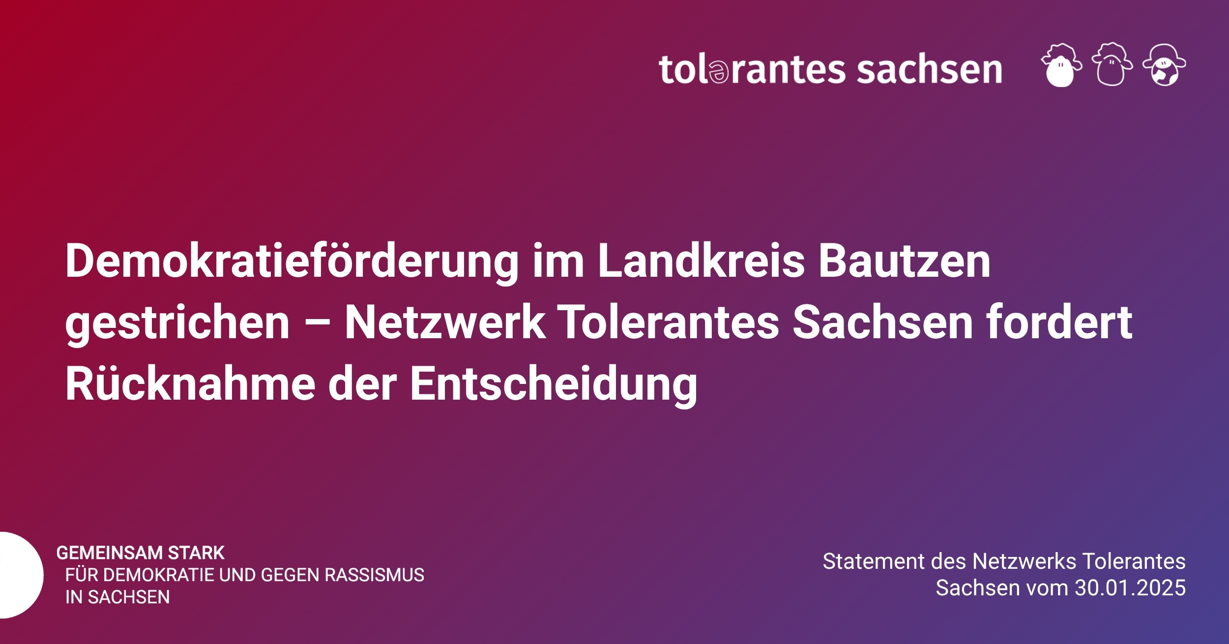 WeiterlesenStatement: Demokratieförderung im Landkreis Bautzen gestrichen – Netzwerk Tolerantes Sachsen fordert Rücknahme der Entscheidung