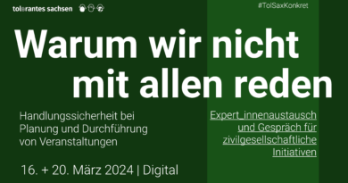 Am 18.06.2011 fand in Dresden die erste Tagung des Netzwerk Tolerantes Sachsen und des Sächsischen Migrant_innenbeirates statt zum Thema „Inklusion“ für Migrant_innen im speziellen, aber auch als allgemein anzustrebendes Gesellschaftsmodell. Die Ergebnisse der Tagung können Sie hier nachlesen.