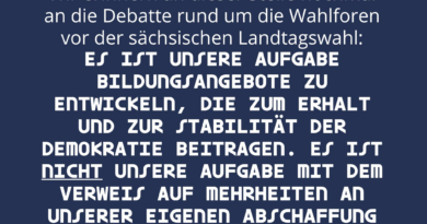 - Eine zügige Freigabe der Mittel im Januar 2024 für das letzte Jahr der aktuellen Förderperiode von „Demokratie leben!“, damit der Erhalt der Arbeit nicht in der Verantwortung der Träger und ihrer Mitarbeitenden liegt. Hierzu müssen die Ministerinnen beim Finanzminister eine Ausnahme geltend machen.