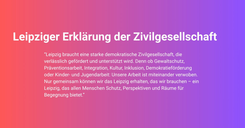 Darum rufen wir alle Vereine, Initiativen, Einrichtungen, solidarische Bürgerinnen und Bürger und Verbände auf: Lasst uns jetzt gemeinsam sichtbar werden, die Stimme zu erheben und deutlich zu machen: Leipzig braucht eine starke demokratische Zivilgesellschaft, die verlässlich gefördert und unterstützt wird. Denn ob Gewaltschutz, Präventionsarbeit, Integration, Kultur, Inklusion, Demokratieförderung oder Kinder- und Jugendarbeit: Unsere Arbeit ist miteinander verwoben. Nur gemeinsam können wir das Leipzig erhalten, das wir brauchen – ein Leipzig, das allen Menschen Schutz, Perspektiven und Räume für Begegnung bietet.
